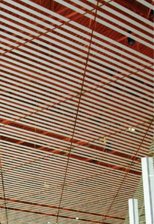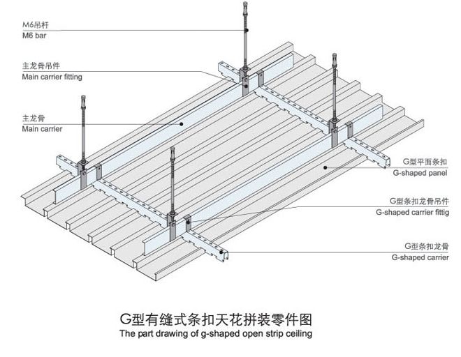 G型有縫式條扣板采用鋁合金平板或沖孔板經靜電噴涂而成,具有防火、防潮,吸音功能,板面及線條的整體及連貫性強,給人一種舒適暢快之感受。廣泛用于機場、大廳、車站及走廊通道等方面。